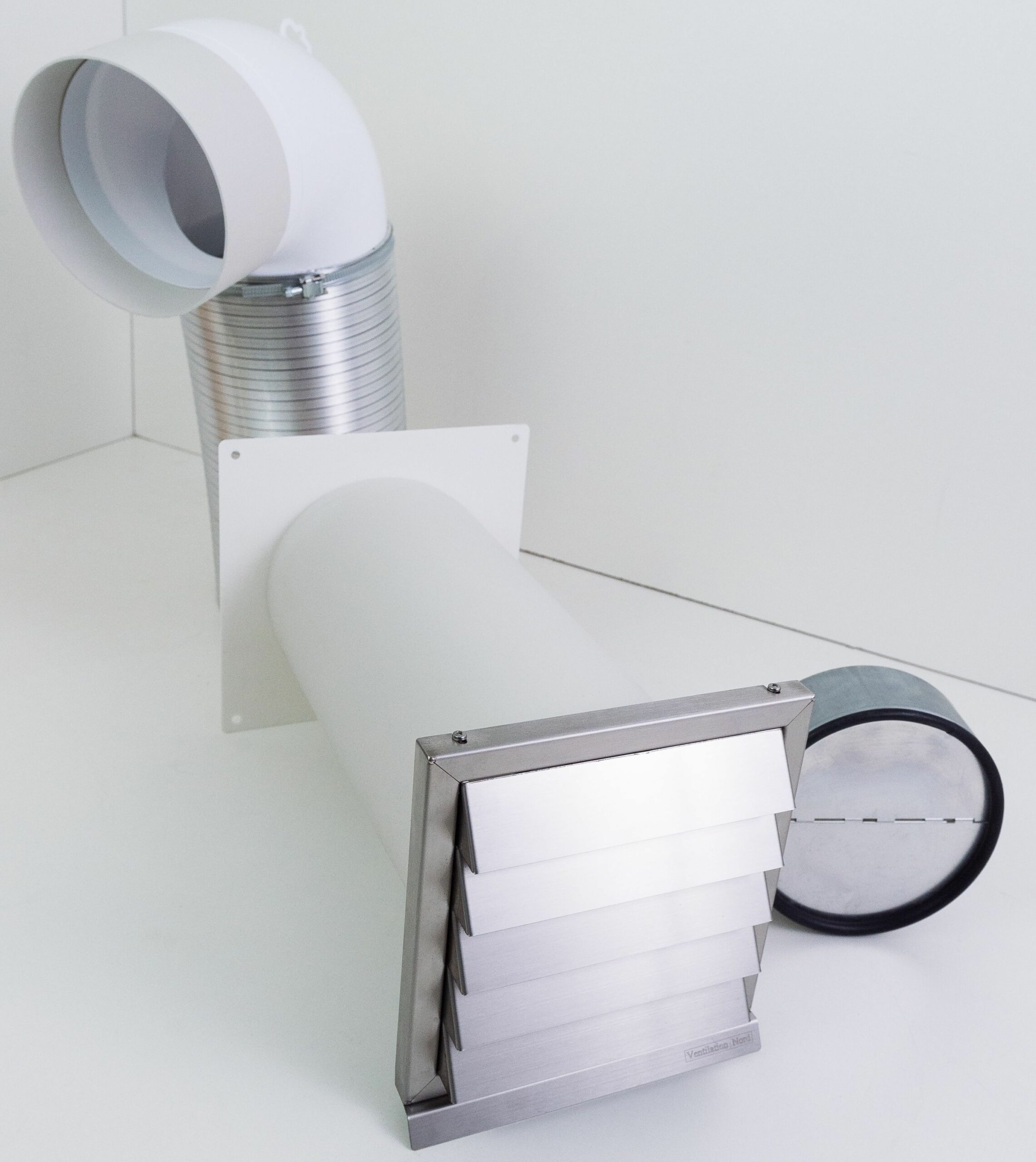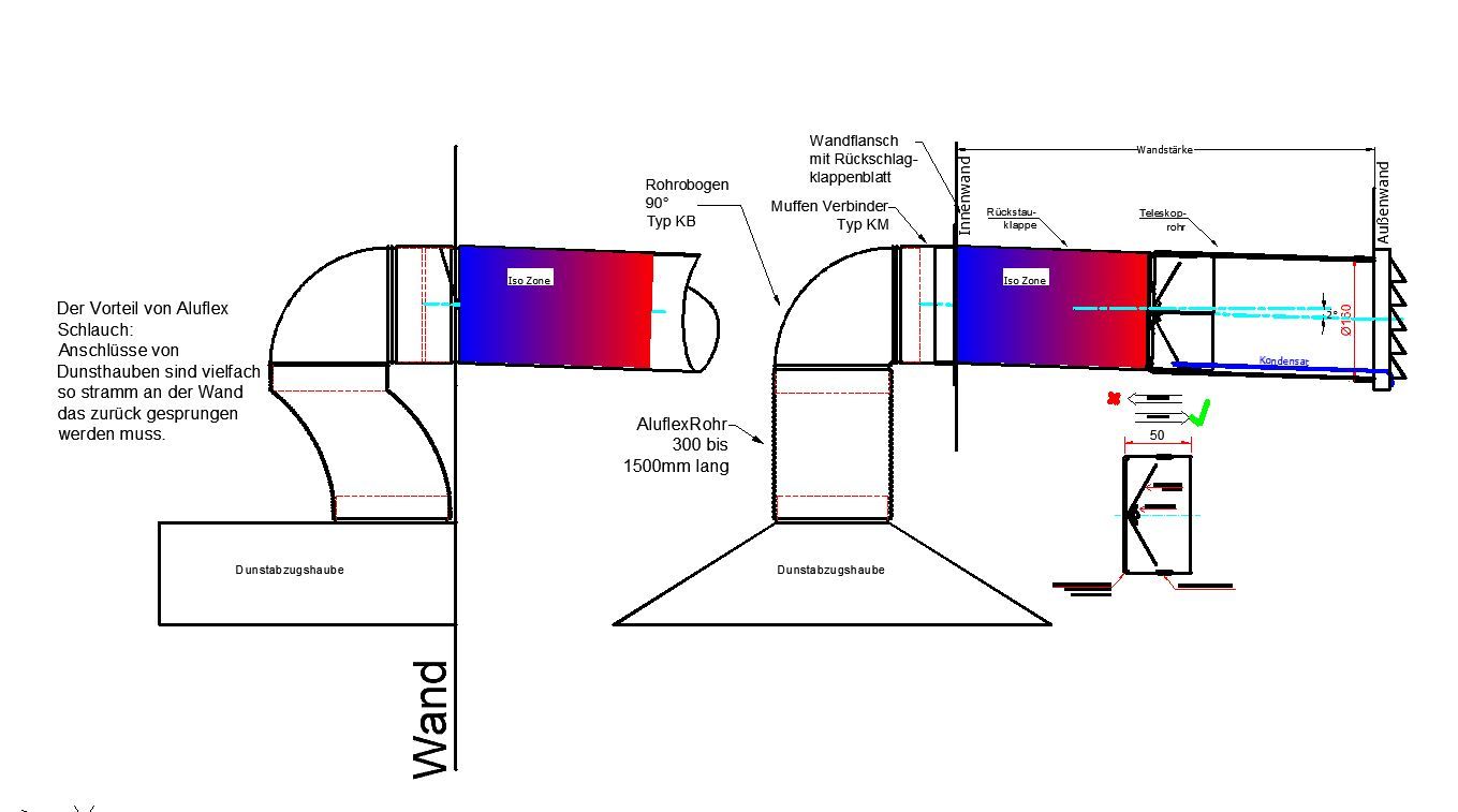 4 Rezensionen für 2 Grad Mauerkasten Ø 100, 125, 150 Rohr Set Edelstahl Dunstabzug Rückstauklappe 2GS1-R-MKWSELFiD, runter zur Haube mit Aluflex