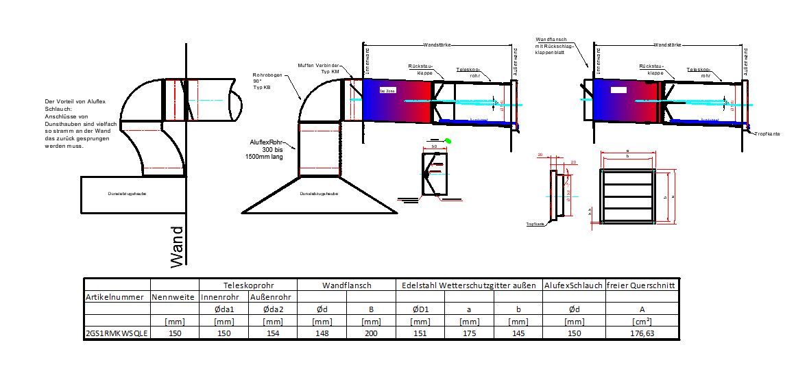 2 Grad Mauerkasten Ø 150 Set Edelstahl Dunstabzug Rückstauklappe 2GS6-K-MKWSELFiD, runter zur Haube mit Aluflex