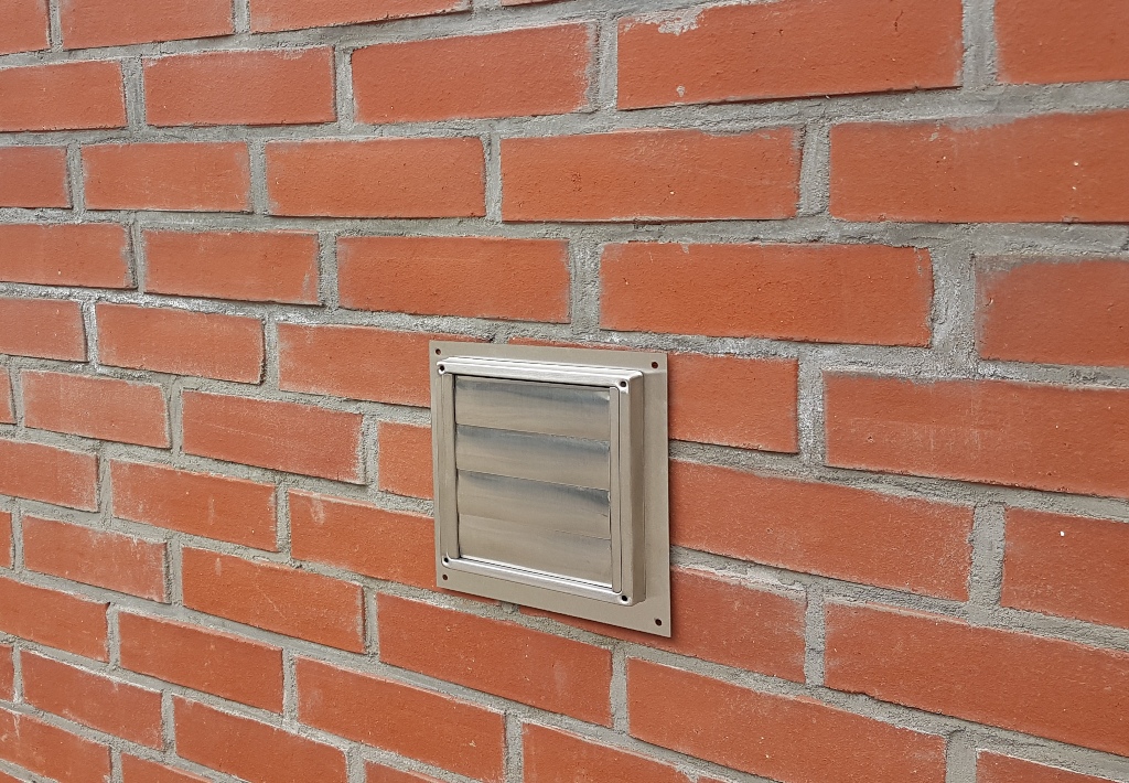 2 Grad Mauerkasten Ø 100, 125, 150 Rohr Set Edelstahl Dunstabzug Rückstauklappe 2GS1-R-MKWSQLE, runter zur Haube mit Aluflex