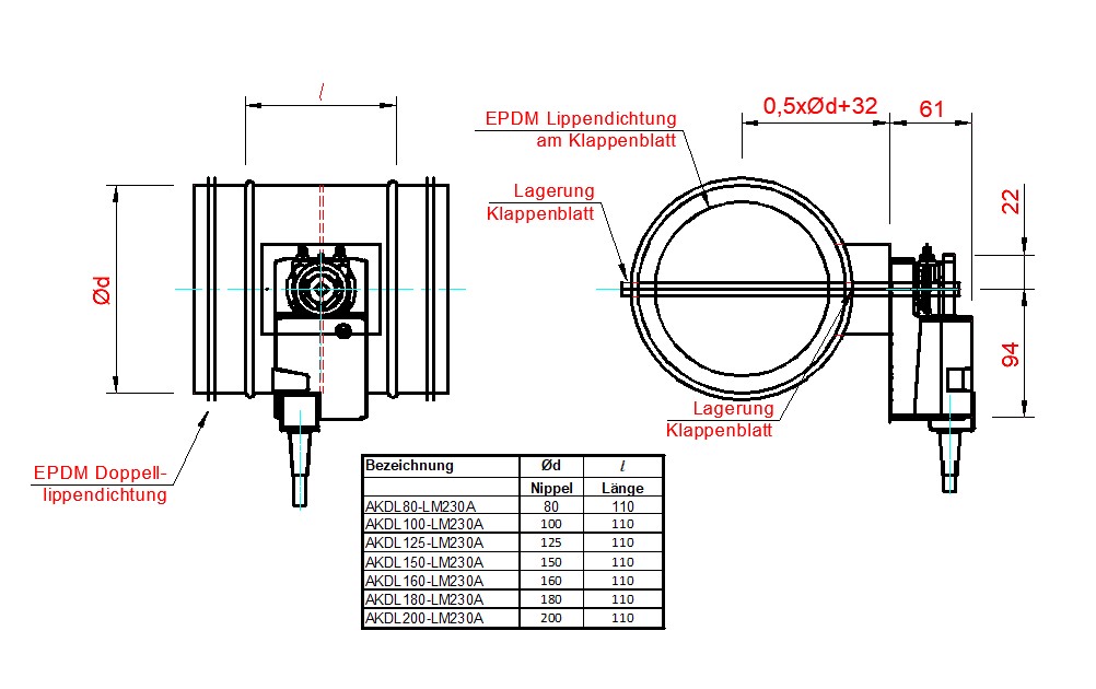 Absperrklappe Stahl verzinkt mit Belimo LM230A für 230V Belimo LM230A für 230V, 5Nm Drehmoment, 150 Sekunden Stellzeit (Zeit von Auf nach Zu) Klappe Stahl verzinkt 275g/m² mit kontinuirlich Bandfeuerverzinkung EPDM Doppellippendichtung für Rohrmontage, Dichtheit für Rohrmontage gemäß DIN EN 1751…