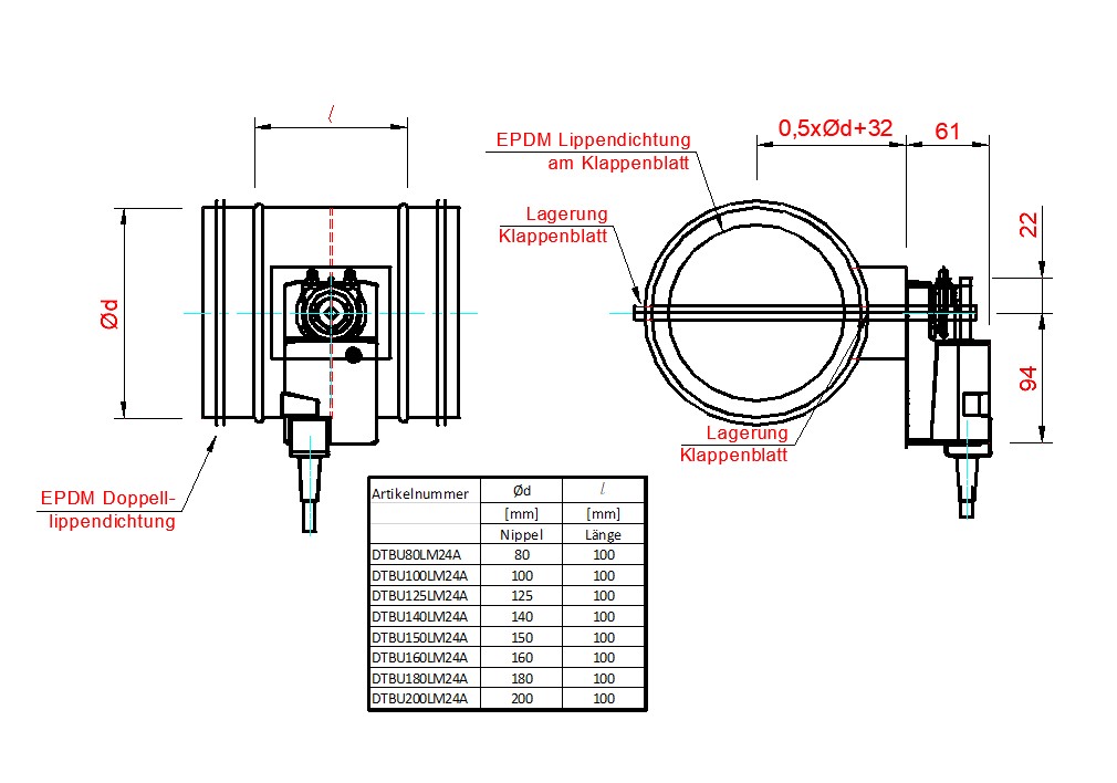 • EPDM Lippendichtung am Klappenblatt,