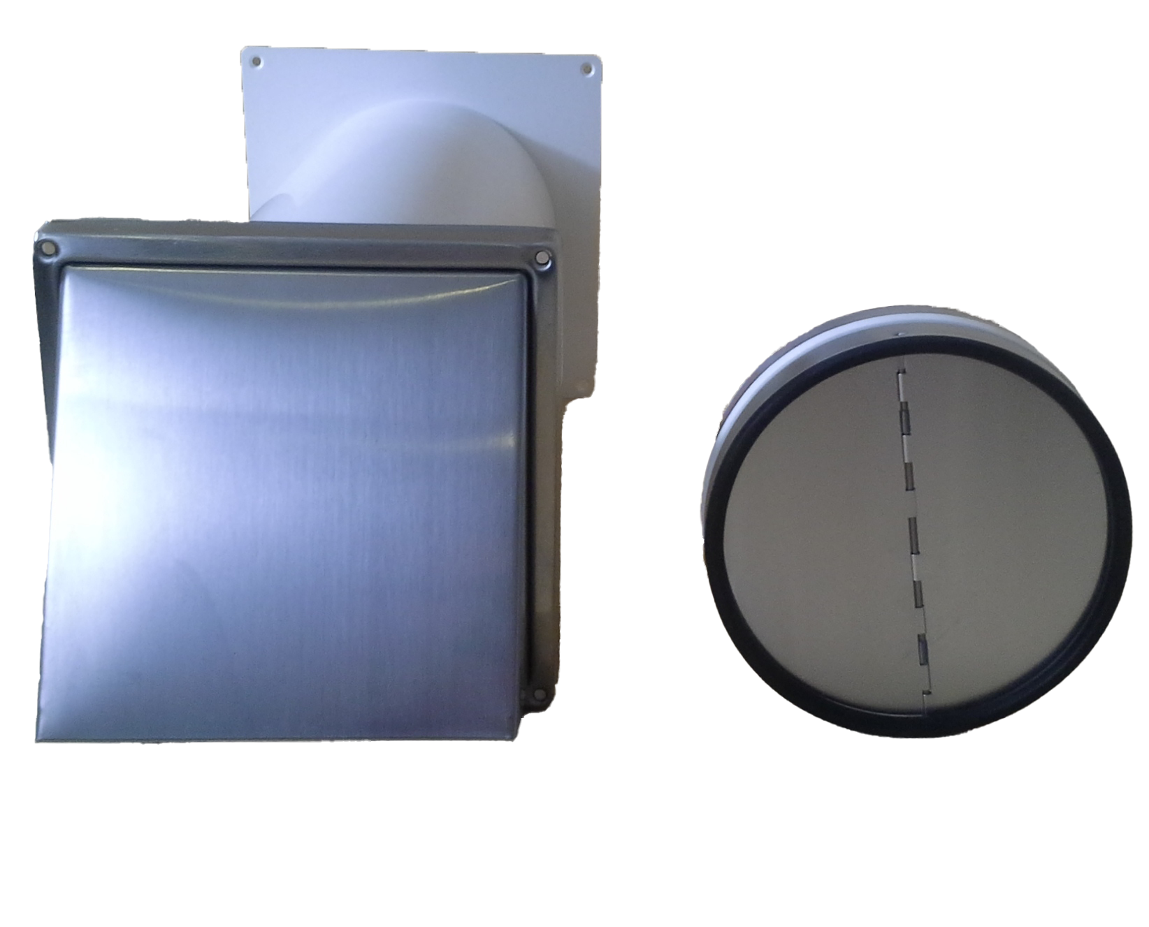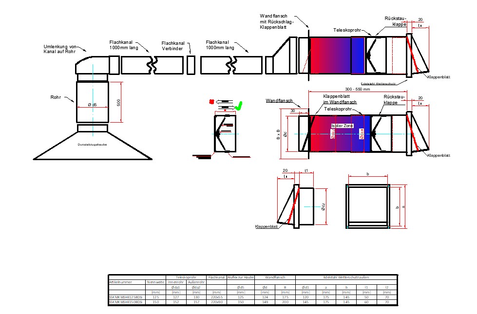 2 Grad Mauerkasten Ø 100, 125, 150 Rohr Set Edelstahl Dunstabzug Rückstauklappe 2GS1-R-MKWSQLE, runter zur Haube mit Aluflex