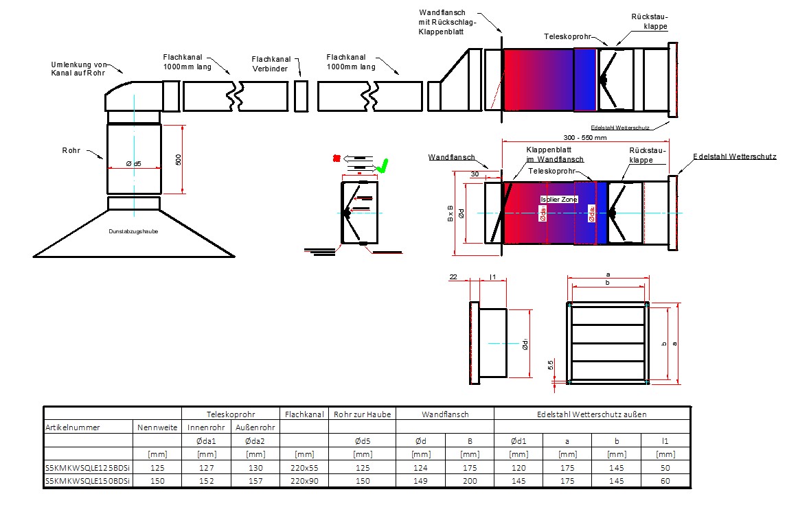 2 Grad Mauerkasten Ø 100, 125, 150 Rohr Set Edelstahl Dunstabzug Rückstauklappe 2GS1-R-MKWSQLE, runter zur Haube mit Aluflex