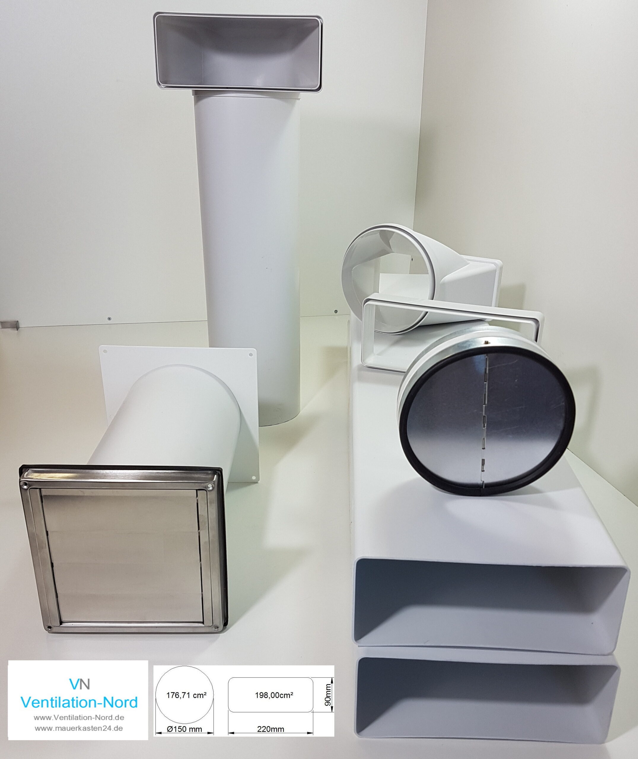 2 Grad Mauerkasten Ø150 mit Flachkanal Set, Edelstahl Wetterschutzgitter, runter zur Haube mit Aluflex