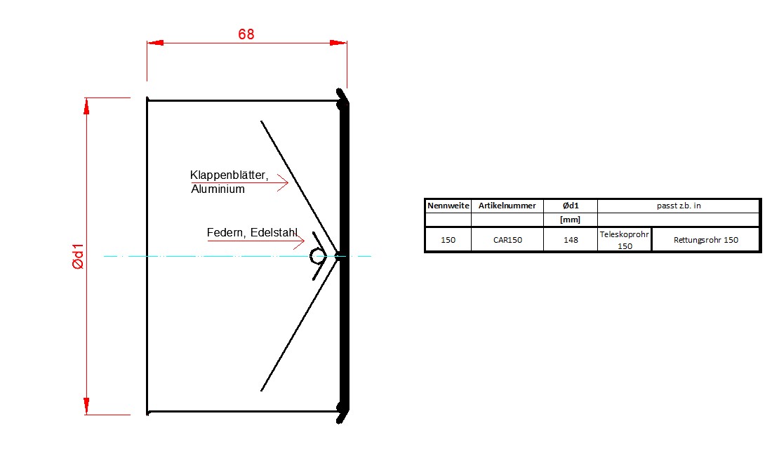 Rückschlagklappe CAR Ø125 oder Ø150mm passt in Teleskoprohr Ø150 und in Rettungsrohr Ø150mm Stahl verzinktes Gehäuse, leichte Aluminium Klappenblätter, Edelstahl Achse und Edelstahl Federn