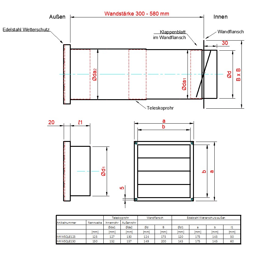 Mauerkasten für z.b. Dunstabzug mit Rückstauklappe im Teleskop Rohr und Edelstahl Wetterschutz